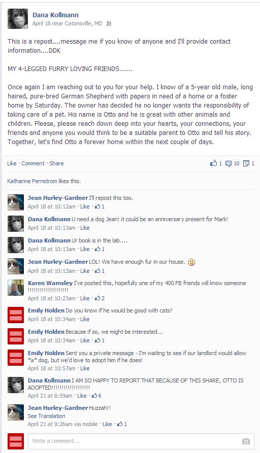 The following day, much to our surprise, our landlord agreed to let us add a dog to our already very full house (for a VERY reasonable pet fee of $20/month) – we were almost positive that he would not agree because he had seemed so adamantly opposed to dog ownership when we signed the initial lease, but very thankful that we were wrong! I enthusiastically updated Dana, and thanked her for sharing the post.
