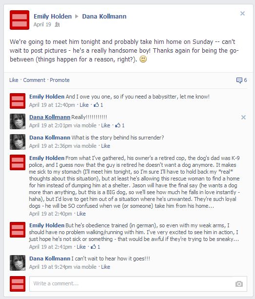 After seeing Dana’s post, I emailed J, who was, of course, exceedingly practical in saying: “he’s too big and our house is too small”. I continued pleading with him though, because I had a very strange strong GUT instinct that told me that we needed this dog as much as he probably needed us. We were each going through a lot of personal struggles, and settling into a fairly unhealthy/sedentary lifestyle, so a dog was one solution we discussed to get us moving (and J had wanted a dog badly for as long as I had known him). I reminded him of this, and he relented, allowing me to email the woman who posted the initial plea. Below is the email exchange with her:
