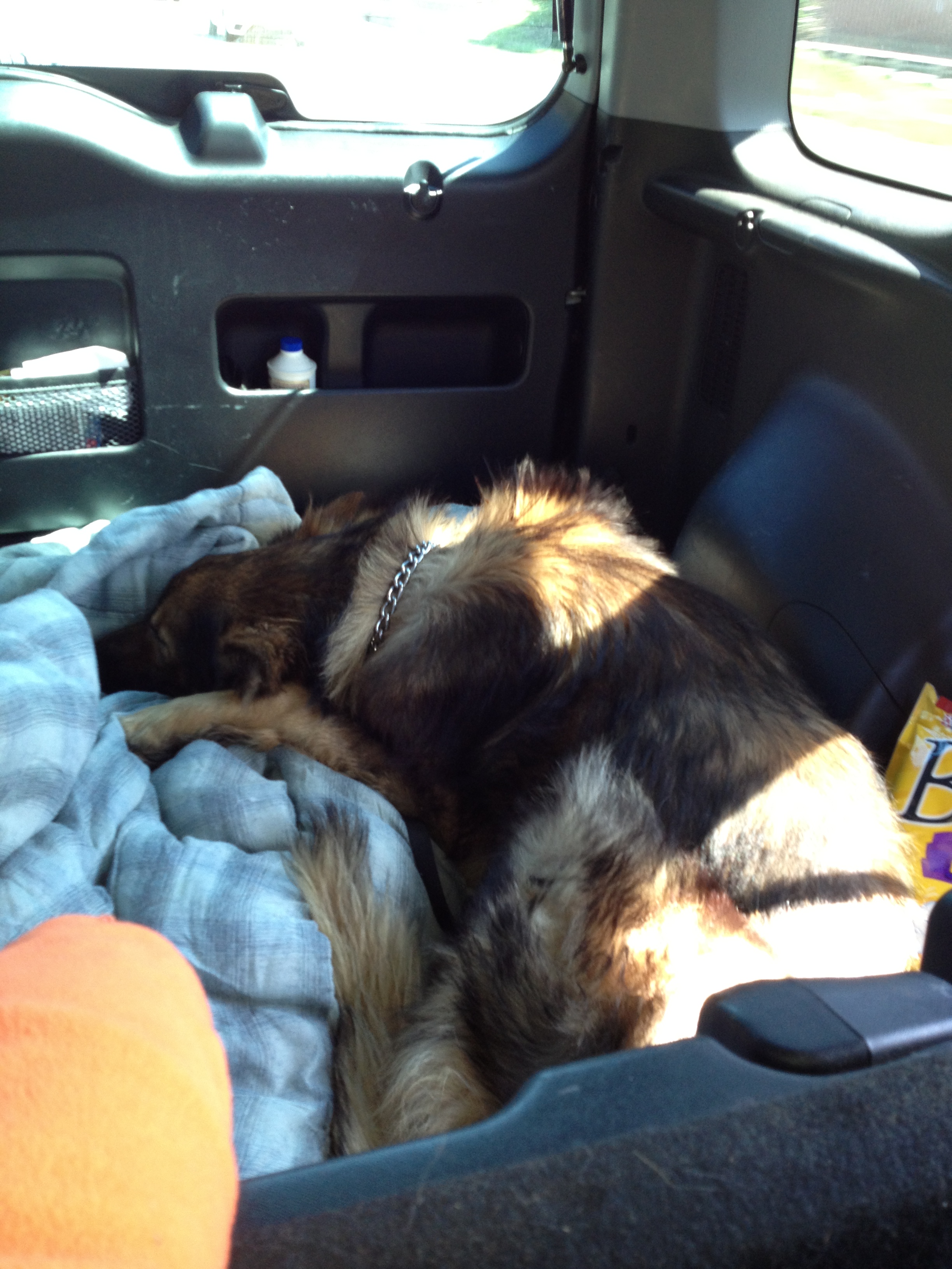 Yesterday, Sunday, April 21st, we brought Otto home. He was neither afraid, nor even remotely hesitant to get into the back of our CRV, and perhaps I am making him a bit anthropomorphous, but to me, he looked relieved. Of course the “crate” they said they would provide was rusty and disgusting, so we met my mother at the Catonsville PetsMart to buy him a new crate. He had a very unpleasant accident in one of the aisles after eating a can of dog food after going probably several days without any real food or water, but my Mom and J helped the employees clean it up, and we got him some new things and packed him up to go home.